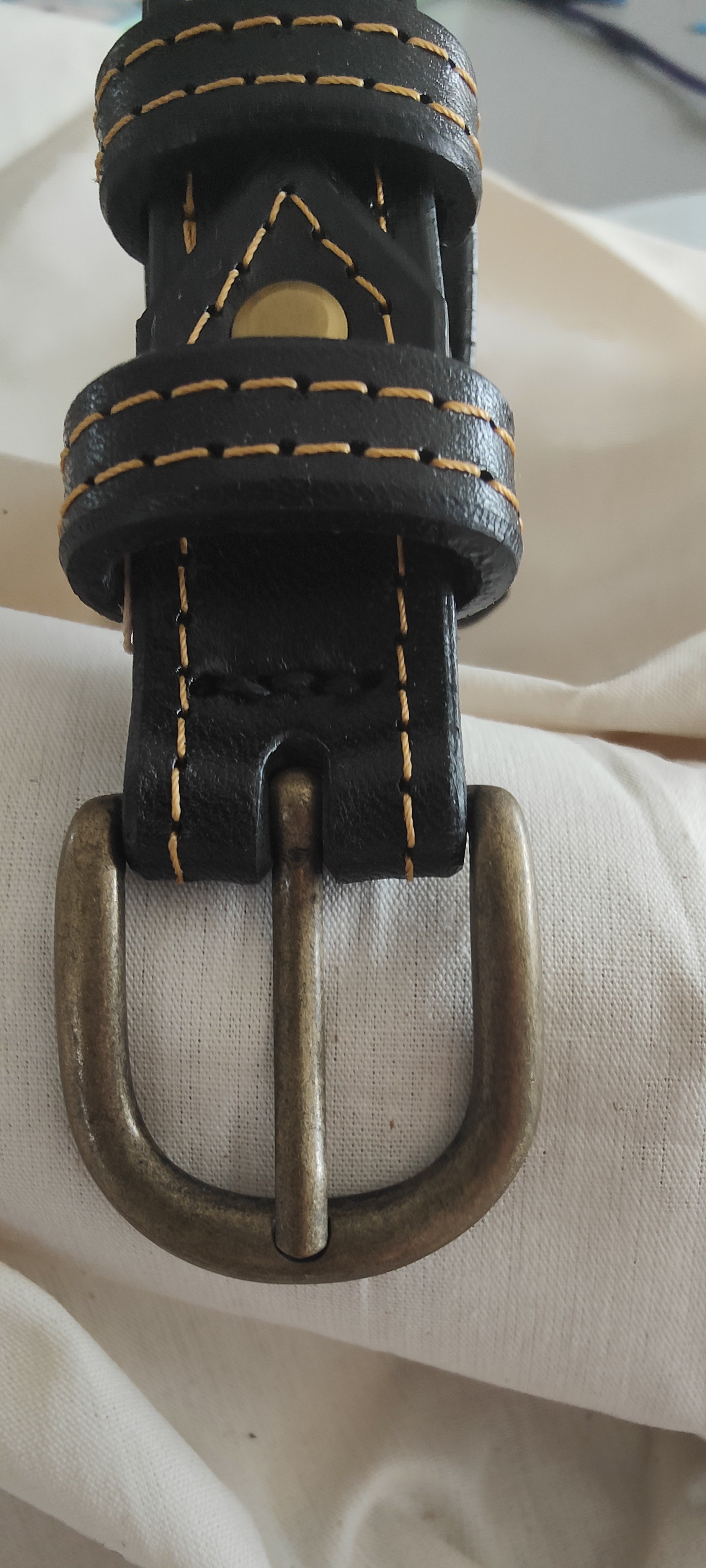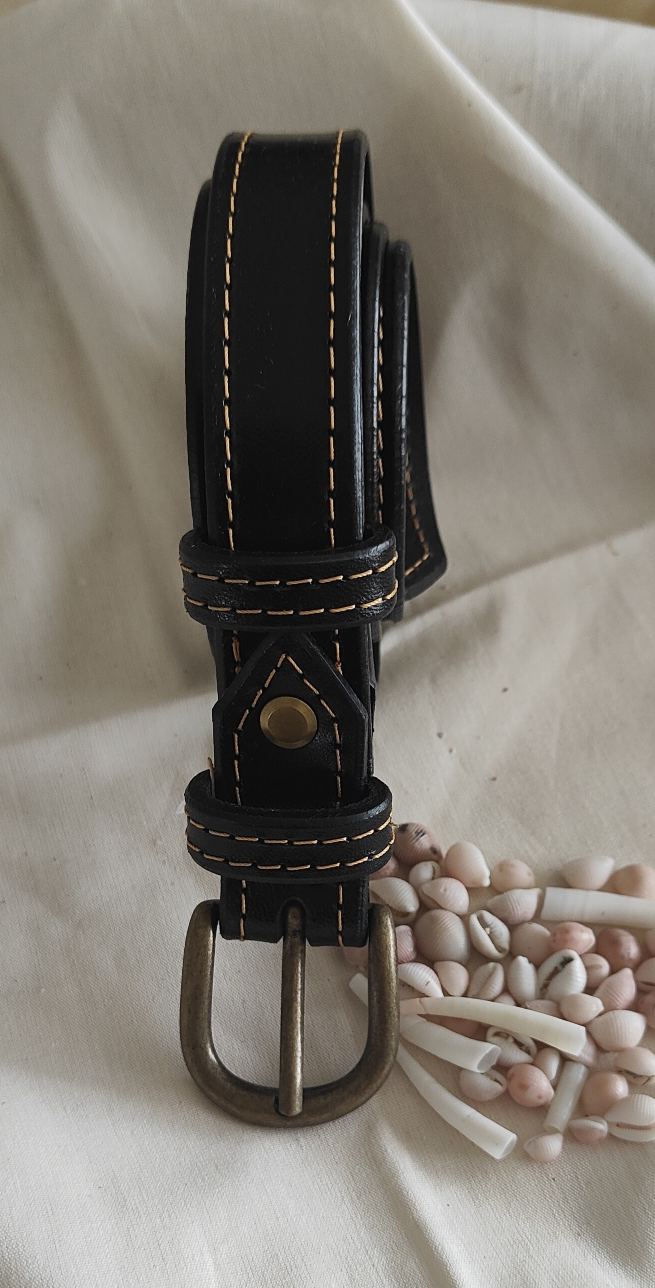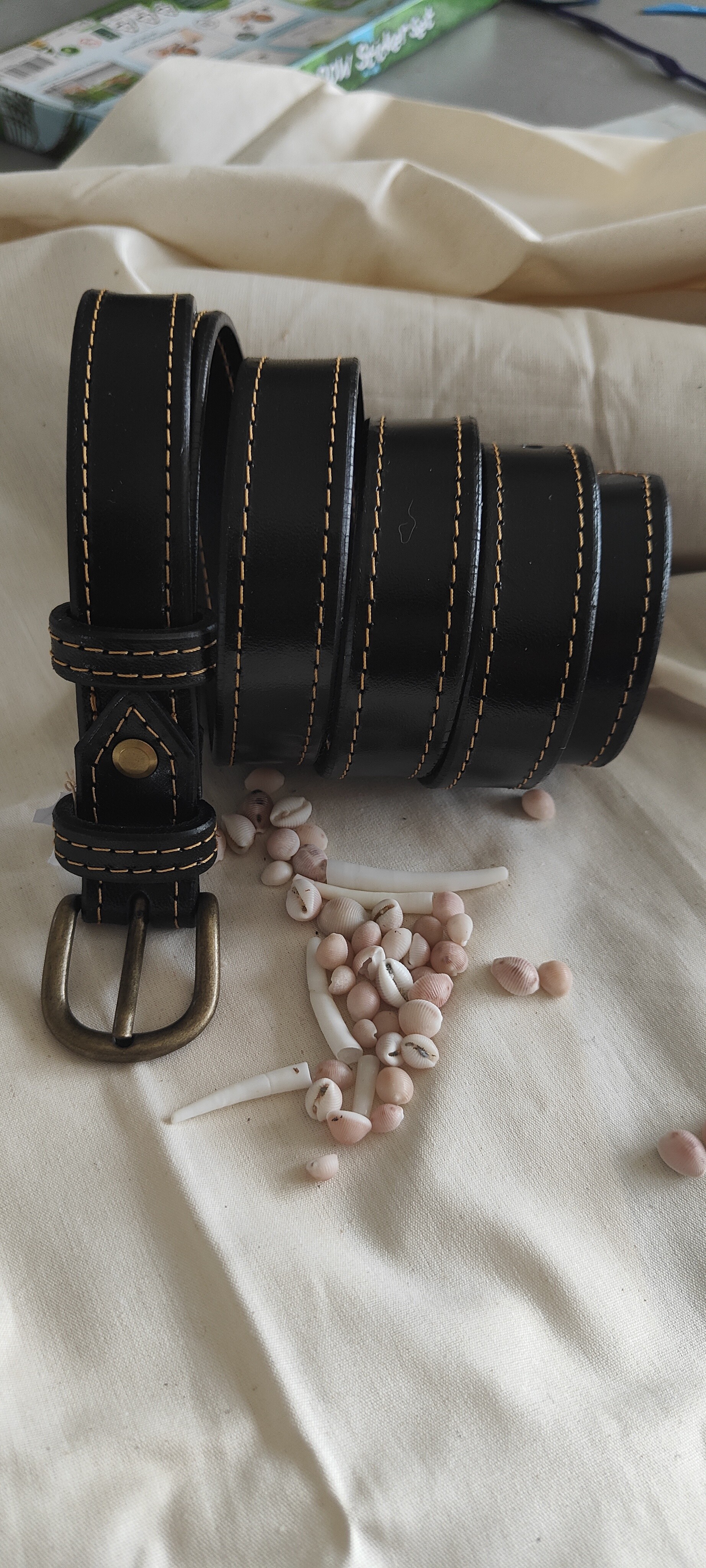 Cuir de bovin tannage végétal tanné à coeur, fil polyester, vis et agraffe laiton et acier, boucle zamak.
