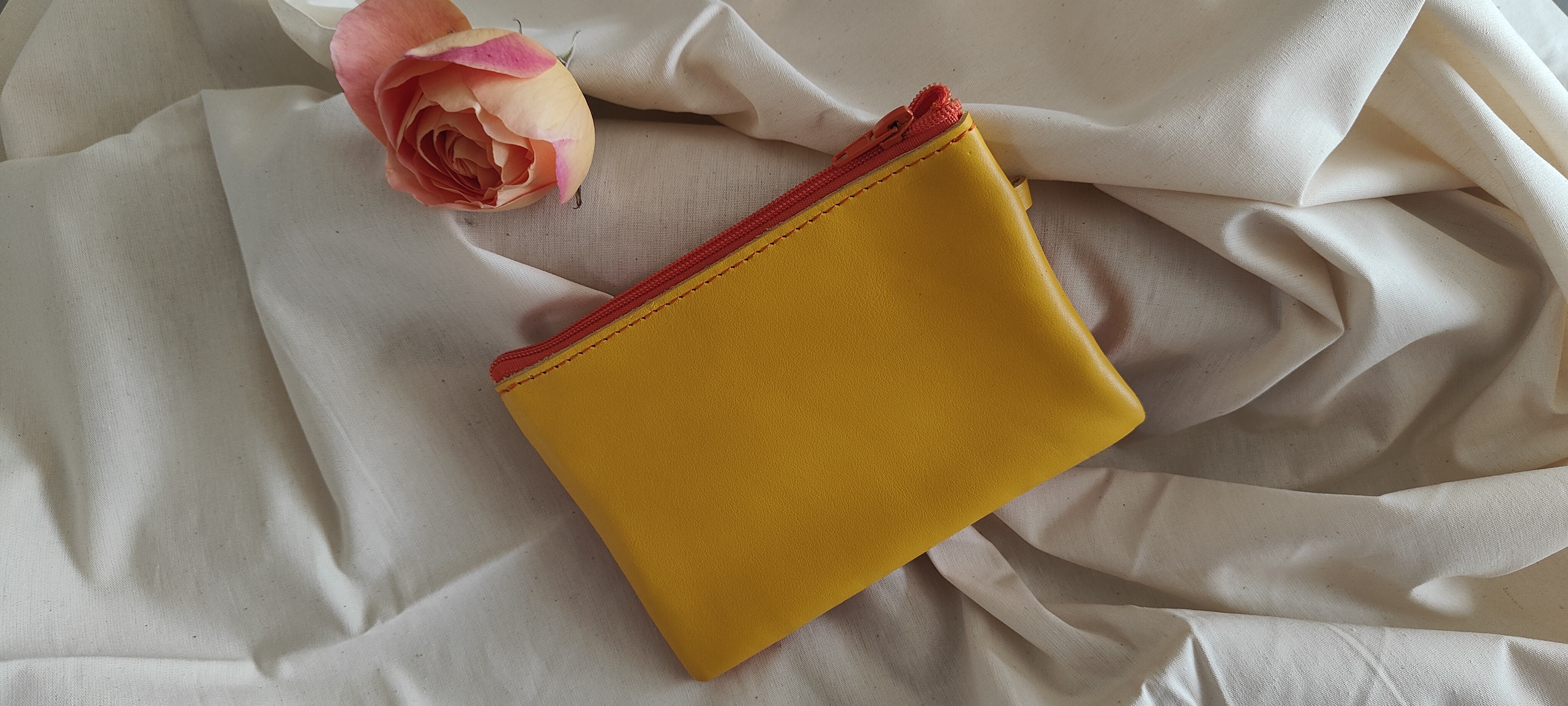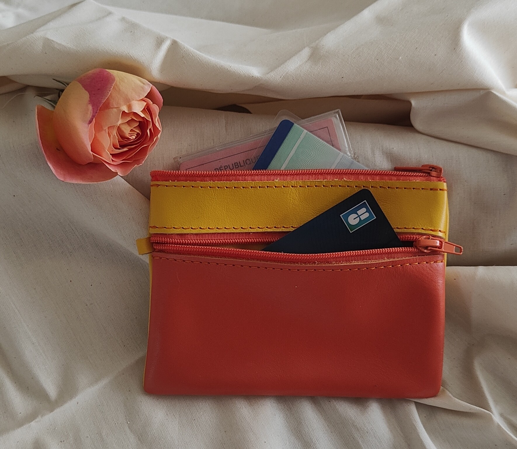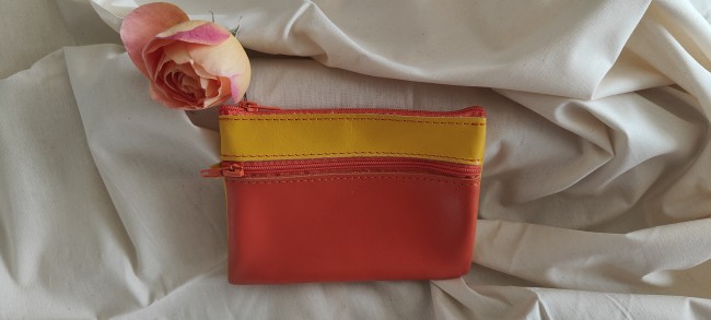 Porte monnaie rectangulaire composé d'une grande et une petite poche fermées par des fermetures éclair et séparées par une doublure en tissu. Il est suffisament grand pour y ranger permis ou carte d'identité, et suffisament plat pour se glisser dans la poche de votre pantalon.